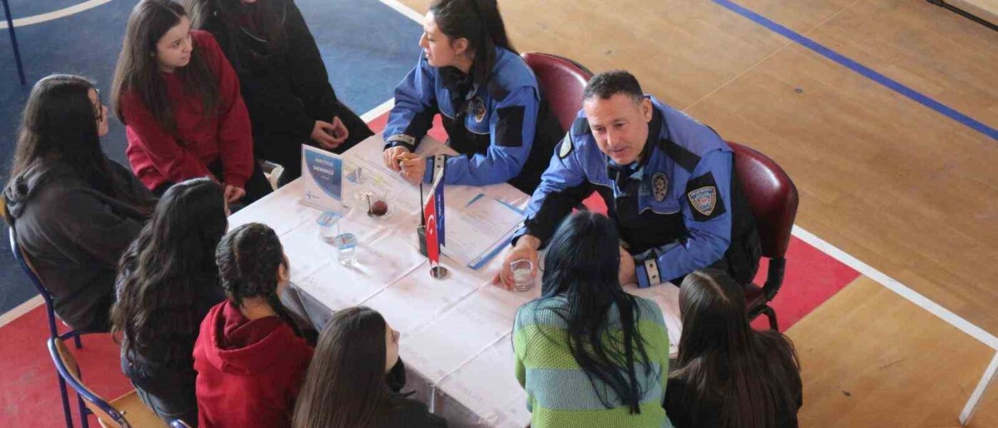 Aydın’ın Germencik ilçesinde lise öğrencileriyle buluşarak Aydın İl Emniyet Müdürlüğü ekipleri, polis olma şartları ve meslek tanıtımı hakkında bilgilendirme yaptı.