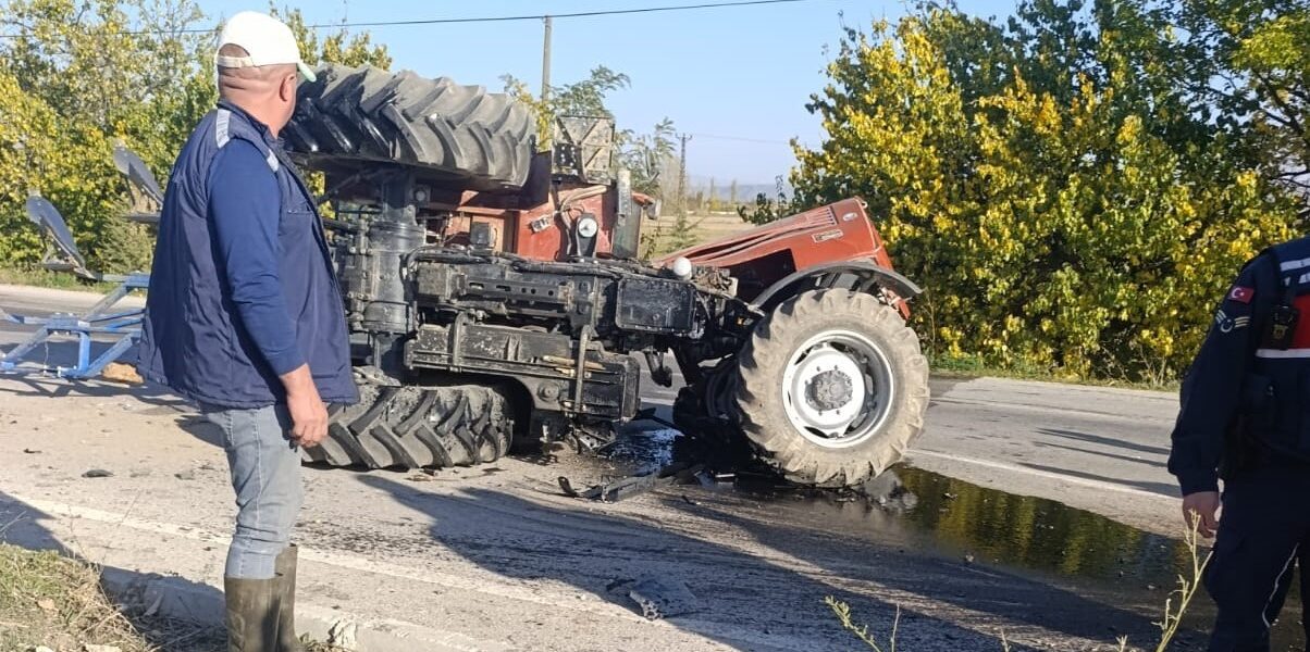 Otomobille çarpışan traktör ikiye bölündü