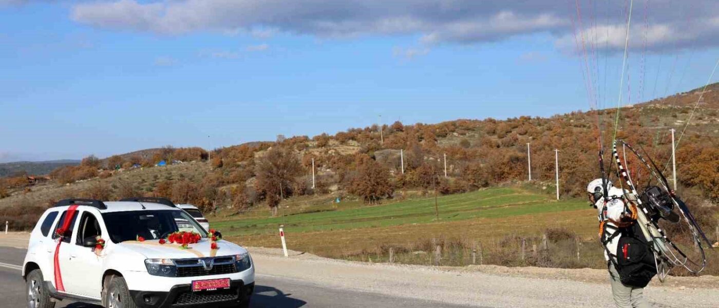 Paramotorla inip gelin arabasının önünü kestiler