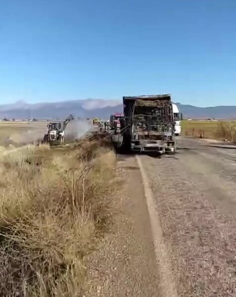 Saman yüklü kamyon yangın sonrası kullanılamaz hale geldi